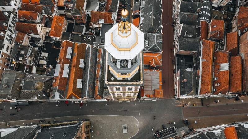 Ooit stond er de kapel van het Heilige Geest gasthuis maar in 1646 ging deze in vlammen op. Na de verwoesting van de kerk en toren van het gasthuis, besloot het stadsbestuur een vrijstaande klokkentoren te bouwen. Beslist geen sinecure: de bouw duurde maar liefst veertien jaar (1649-1663). Timmermeester Dirck Jansz ontwierp de stenen onderbouw, het ontwerp van de lantaarn wordt toegeschreven aan Philips Vingboons. Saillant detail: Vingboons’ lantaarn zou een oorspronkelijk maar uiteindelijk niet gerealiseerd ontwerp zijn voor het Stadhuis van Amsterdam, nu het Paleis op de Dam.
